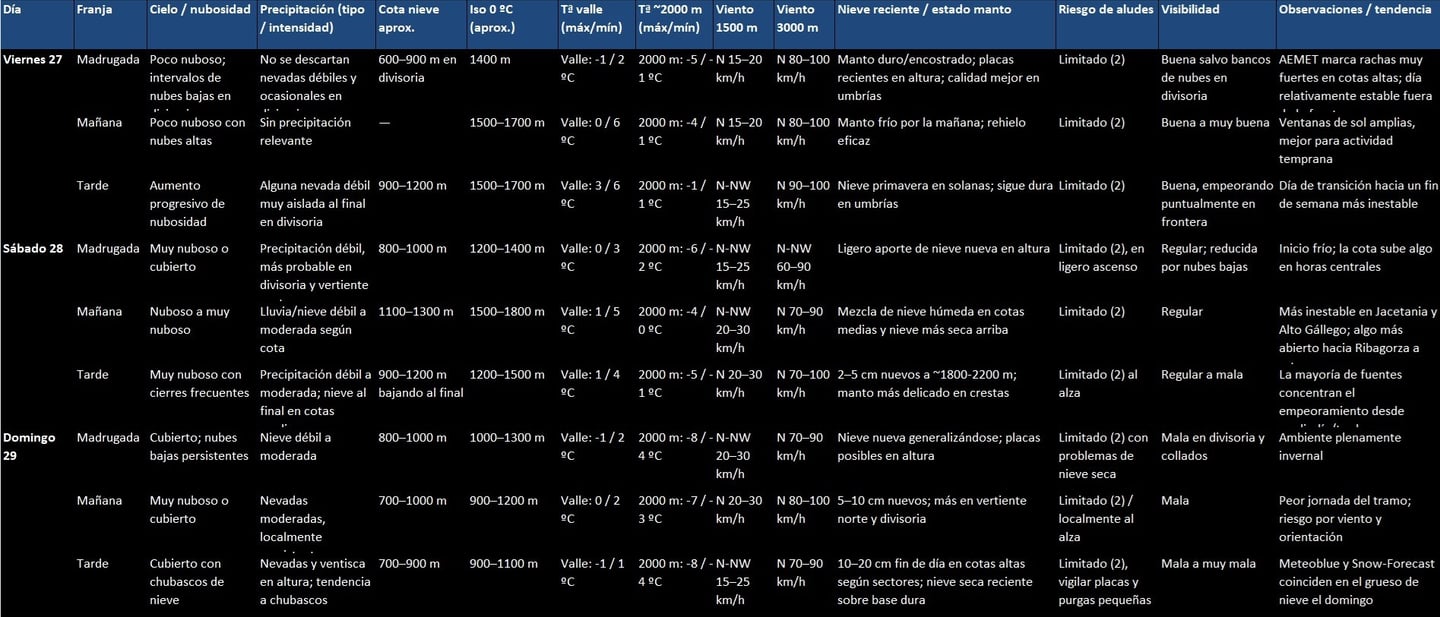 Aquí aparece más incertidumbre en el detalle horario, pero no en la tendencia: día más gris y más húmedo, con deterioro más claro desde el mediodía y sobre todo por la tarde. La cota de nieve se sitúa en torno a 800 m al inicio y final del día, subiendo temporalmente a 1100–1300 m en las horas centrales. Para Formigal habla de mezcla de lluvia y nieve con 2–5 mm, y para Sallent de Gállego eleva la señal a 5–10 mm, lo que encaja con precipitación floja a moderada según zona y altitud. Se prevee una ligera nevada el sábado por la noche.